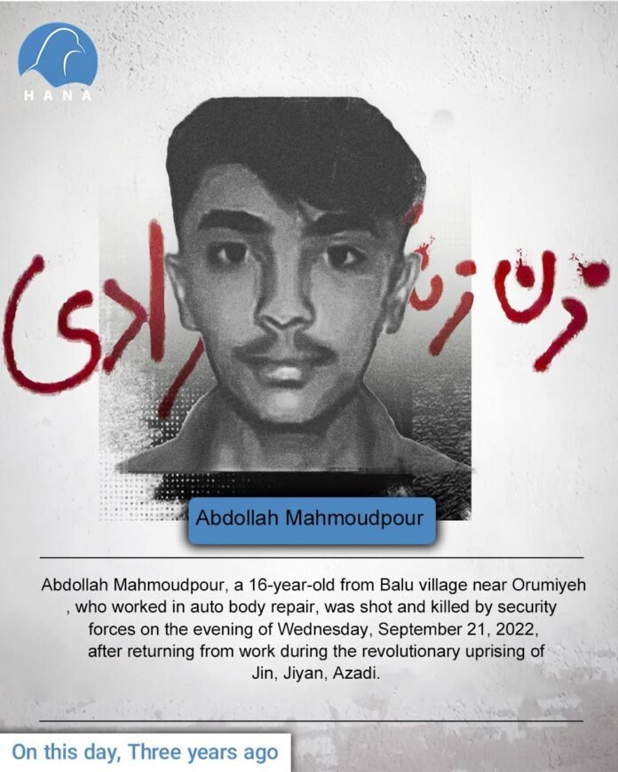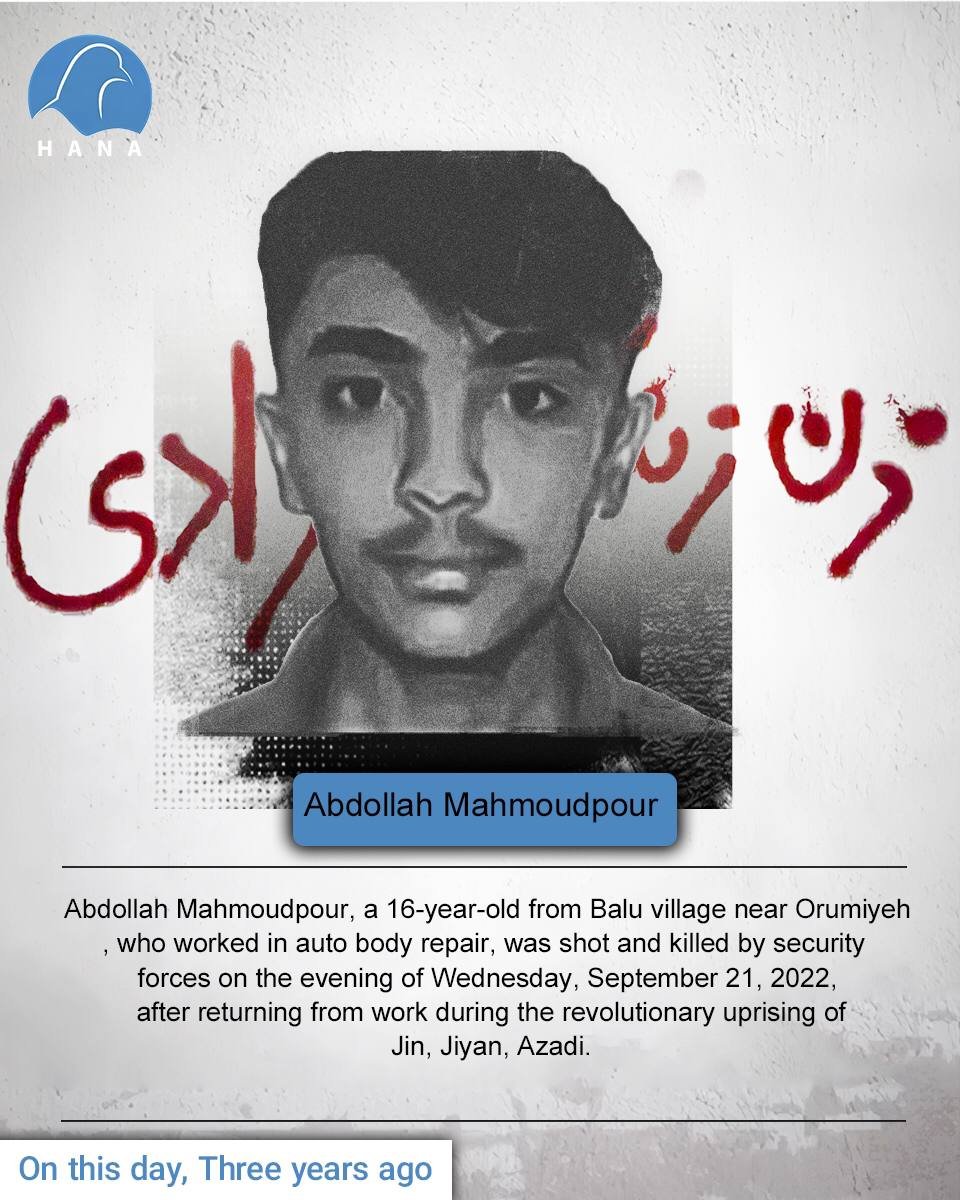 Abdollah Mahmoudpour, a 16-year-old from Balu village near Orumiyeh, who worked in auto body repair, was shot and killed by security forces on the evening of Wednesday, September 21, 2022, after returning from work during the revolutionary uprising of Jin, Jiyan, Azadi.