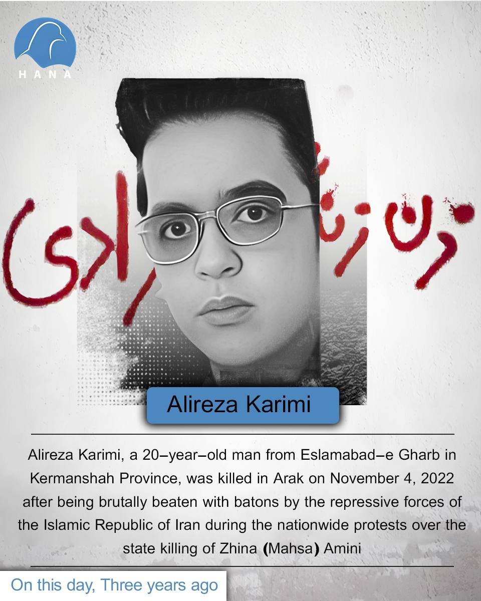 Alireza Karimi, a 20-year-old man from Eslamabad-e Gharb in Kermanshah Province, was killed in Arak on November 4, 2022 after being brutally beaten with batons by the repressive forces of the Islamic Republic of Iran during the nationwide protests over the state killing of Zhina (Mahsa) Amini.