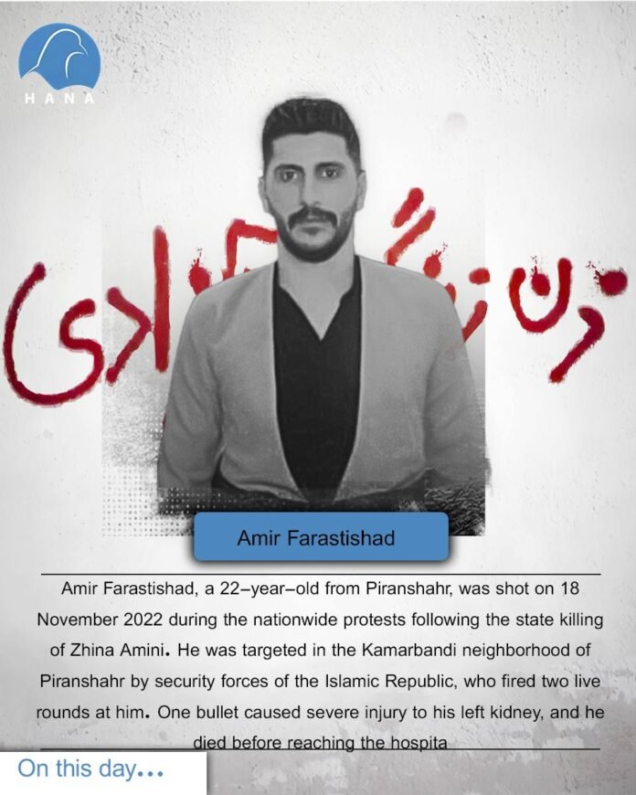 Amir Farastishad, a 22-year-old from Piranshahr, was shot on 18 November 2022 during the nationwide protests following the state killing of Zhina Amini. He was targeted in the Kamarbandi neighborhood of Piranshahr by security forces of the Islamic Republic, who fired two live rounds at him. One bullet caused severe injury to his left kidney, and he died before reaching the hospital.