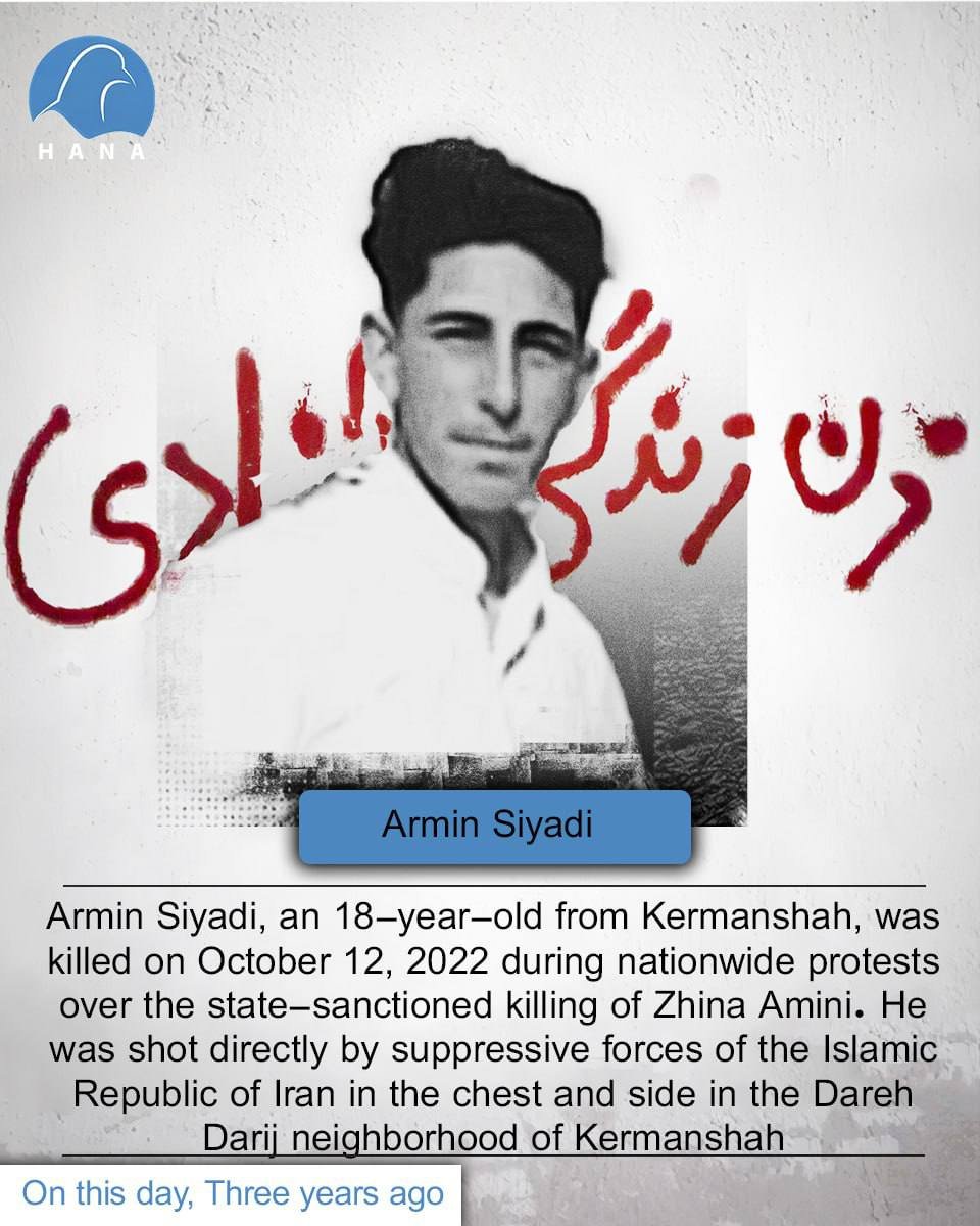 Armin Siyadi, an 18-year-old from Kermanshah, was killed on October 12, 2022 during nationwide protests over the state-sanctioned killing of Zhina Amini. He was shot directly by suppressive forces of the Islamic Republic of Iran in the chest and side in the Dareh Darij neighborhood of Kermanshah.