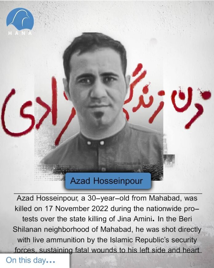 Azad Hosseinpour, a 30-year-old from Mahabad, was killed on 17 November 2022 during the nationwide protests over the state killing of Jina Amini. In the Beri Shilanan neighborhood of Mahabad, he was shot directly with live ammunition by the Islamic Republic’s security forces, sustaining fatal wounds to his left side and heart.