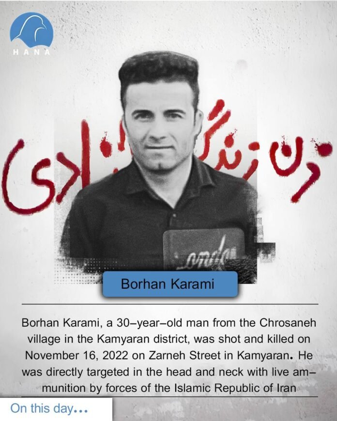 Borhan Karami, a 30-year-old man from the Chrosaneh village in the Kamyaran district, was shot and killed on November 16, 2022 on Zarneh Street in Kamyaran. He was directly targeted in the head and neck with live ammunition by forces of the Islamic Republic of Iran.