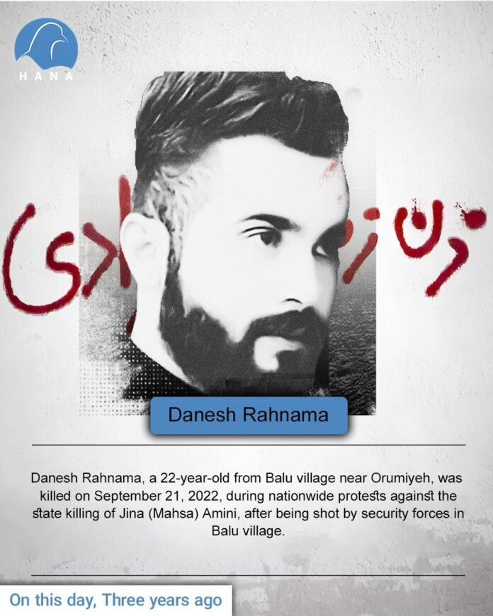 Danesh Rahnama, a 22-year-old from Balu village near Orumiyeh, was killed on September 21, 2022, during nationwide protests against the state killing of Jina (Mahsa) Amini, after being shot by security forces in Balu village.