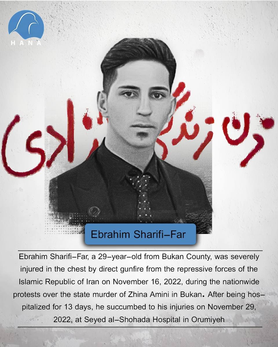 Ebrahim Sharifi-Far, a 29-year-old from Bukan County, was severely injured in the chest by direct gunfire from the repressive forces of the Islamic Republic of Iran on November 16, 2022, during the nationwide protests over the state murder of Zhina Amini in Bukan. After being hospitalized for 13 days, he succumbed to his injuries on November 29, 2022, at Seyed al-Shohada Hospital in Orumiyeh.