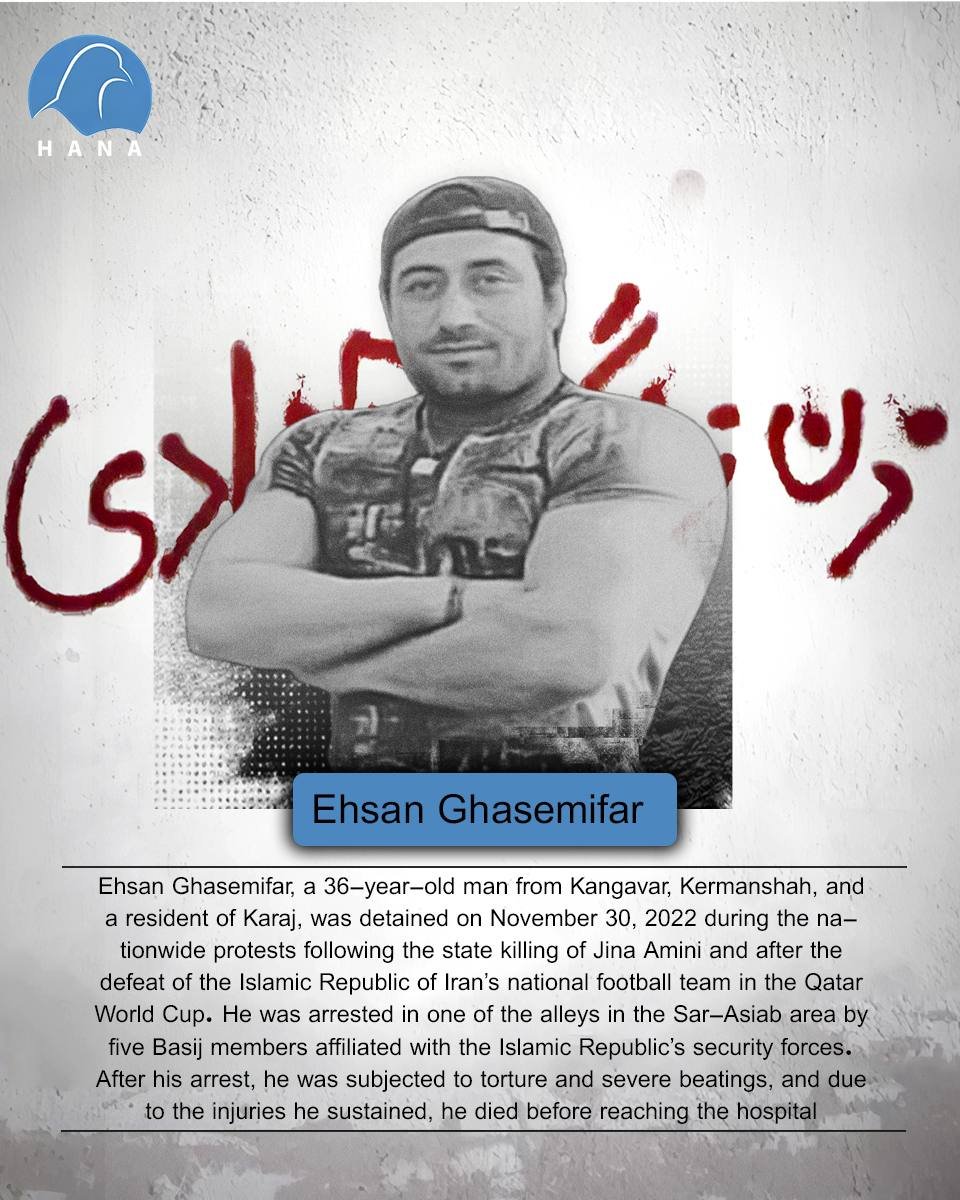 Ehsan Ghasemifar, a 36-year-old man from Kangavar, Kermanshah, and a resident of Karaj, was detained on November 30, 2022 during the nationwide protests following the state killing of Jina Amini and after the defeat of the Islamic Republic of Iran’s national football team in the Qatar World Cup. He was arrested in one of the alleys in the Sar-Asiab area by five Basij members affiliated with the Islamic Republic’s security forces. After his arrest, he was subjected to torture and severe beatings, and due to the injuries he sustained, he died before reaching the hospital.