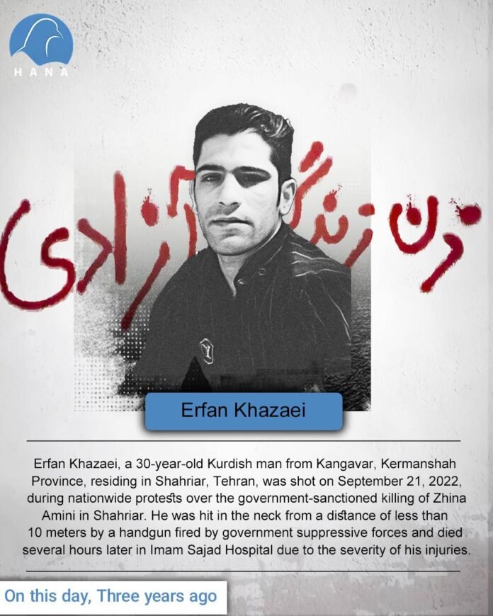 Erfan Khazaei, a 30-year-old Kurdish man from Kangavar, Kermanshah Province, residing in Shahriar, Tehran, was shot on September 21, 2022, during nationwide protests over the government-sanctioned killing of Zhina Amini in Shahriar. He was hit in the neck from a distance of less than 10 meters by a handgun fired by government suppressive forces and died several hours later in Imam Sajad Hospital due to the severity of his injuries.