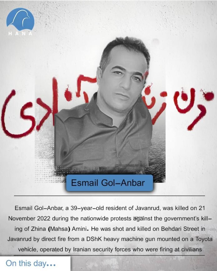 Esmail Gol-Anbar, a 39-year-old resident of Javanrud, was killed on 21 November 2022 during the nationwide protests against the government’s killing of Zhina (Mahsa) Amini. He was shot and killed on Behdari Street in Javanrud by direct fire from a DShK heavy machine gun mounted on a Toyota vehicle, operated by Iranian security forces who were firing at civilians.