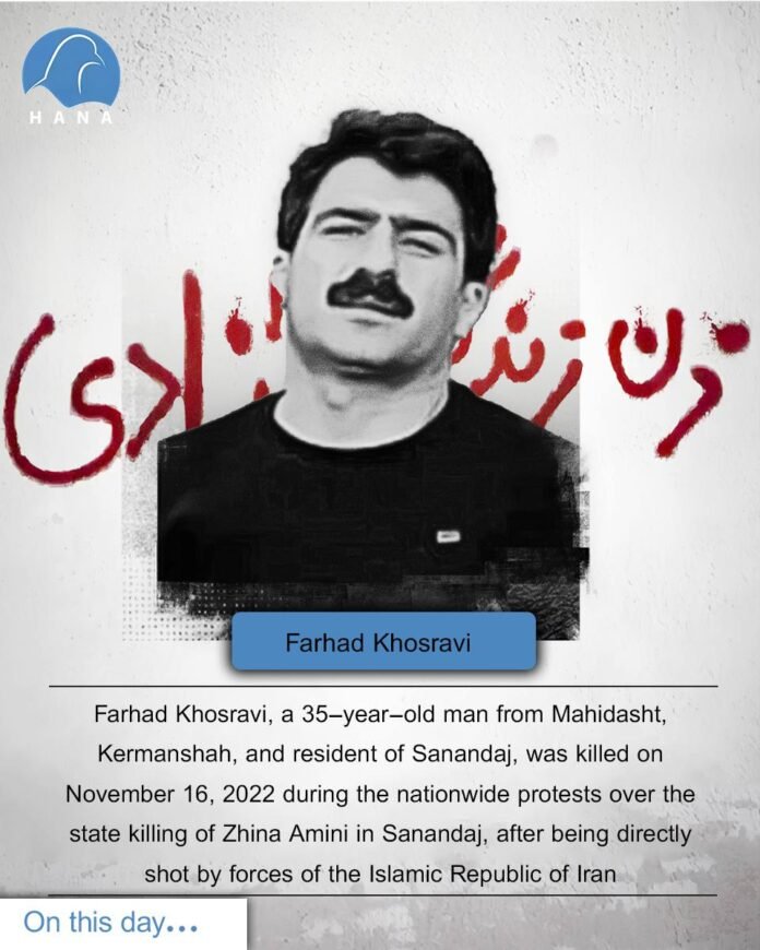 Farhad Khosravi, a 35-year-old man from Mahidasht, Kermanshah, and resident of Sanandaj, was killed on November 16, 2022 during the nationwide protests over the state killing of Zhina Amini in Sanandaj, after being directly shot by forces of the Islamic Republic of Iran.