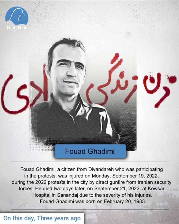 Fouad Ghadimi, a citizen from Divandareh who was participating in the protests, was injured on Monday, September 19, 2022, during the 2022 protests in the city by direct gunfire from Iranian security forces. He died two days later, on September 21, 2022, at Kowsar Hospital in Sanandaj due to the severity of his injuries. Fouad Ghadimi was born on February 20, 1983.