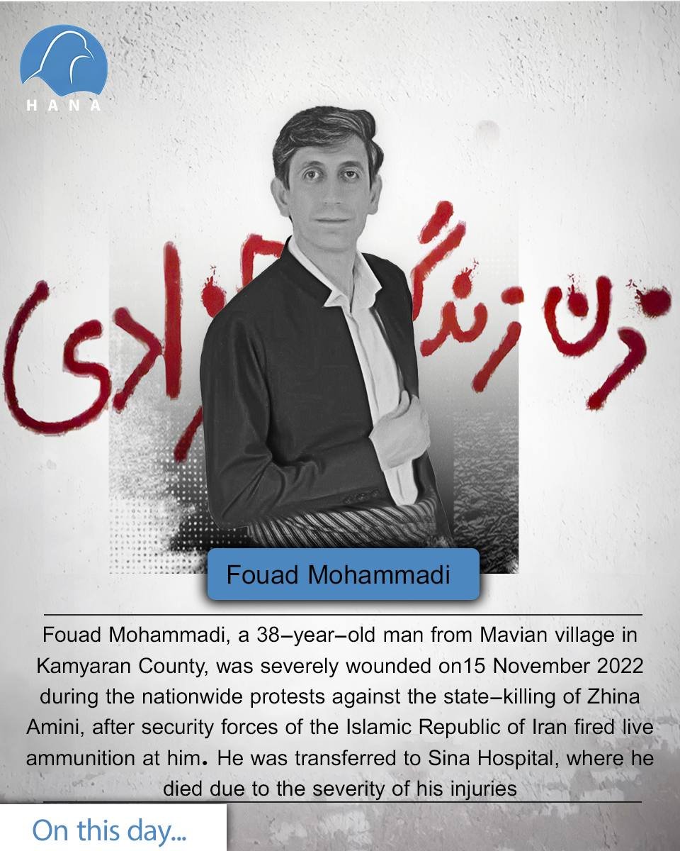 Fouad Mohammadi, a 38-year-old man from Mavian village in Kamyaran County, was severely wounded on15 November 2022 during the nationwide protests against the state-killing of Zhina Amini, after security forces of the Islamic Republic of Iran fired live ammunition at him. He was transferred to Sina Hospital, where he died due to the severity of his injuries.