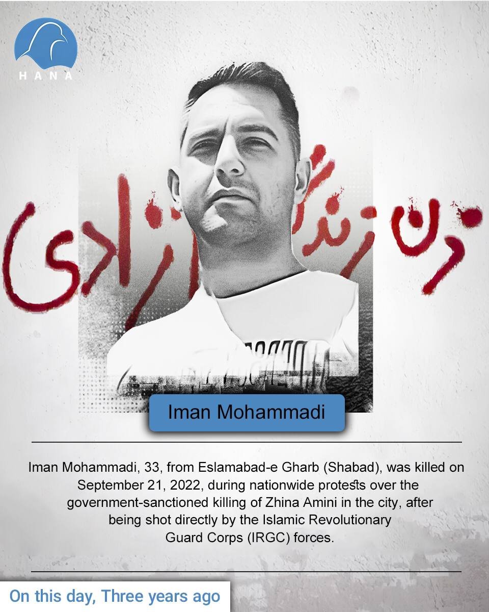 Iman Mohammadi, 33, from Eslamabad-e Gharb (Shabad), was killed on September 21, 2022, during nationwide protests over the government-sanctioned killing of Zhina Amini in the city, after being shot directly by the Islamic Revolutionary Guard Corps (IRGC) forces.