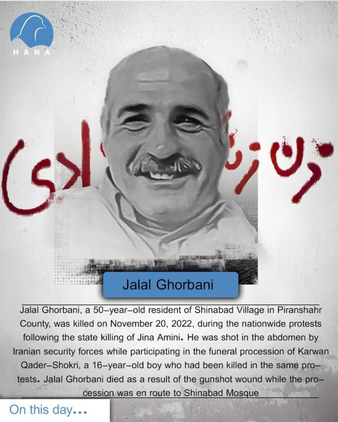 Jalal Ghorbani, a 50-year-old resident of Shinabad Village in Piranshahr County, was killed on November 20, 2022, during the nationwide protests following the state killing of Jina Amini. He was shot in the abdomen by Iranian security forces while participating in the funeral procession of Karwan Qader-Shokri, a 16-year-old boy who had been killed in the same protests. Jalal Ghorbani died as a result of the gunshot wound while the procession was en route to Shinabad Mosque.