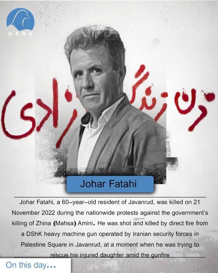 Johar Fatahi, a 60-year-old resident of Javanrud, was killed on 21 November 2022 during the nationwide protests against the government’s killing of Zhina (Mahsa) Amini. He was shot and killed by direct fire from a DShK heavy machine gun operated by Iranian security forces in Palestine Square in Javanrud, at a moment when he was trying to rescue his injured daughter amid the gunfire.