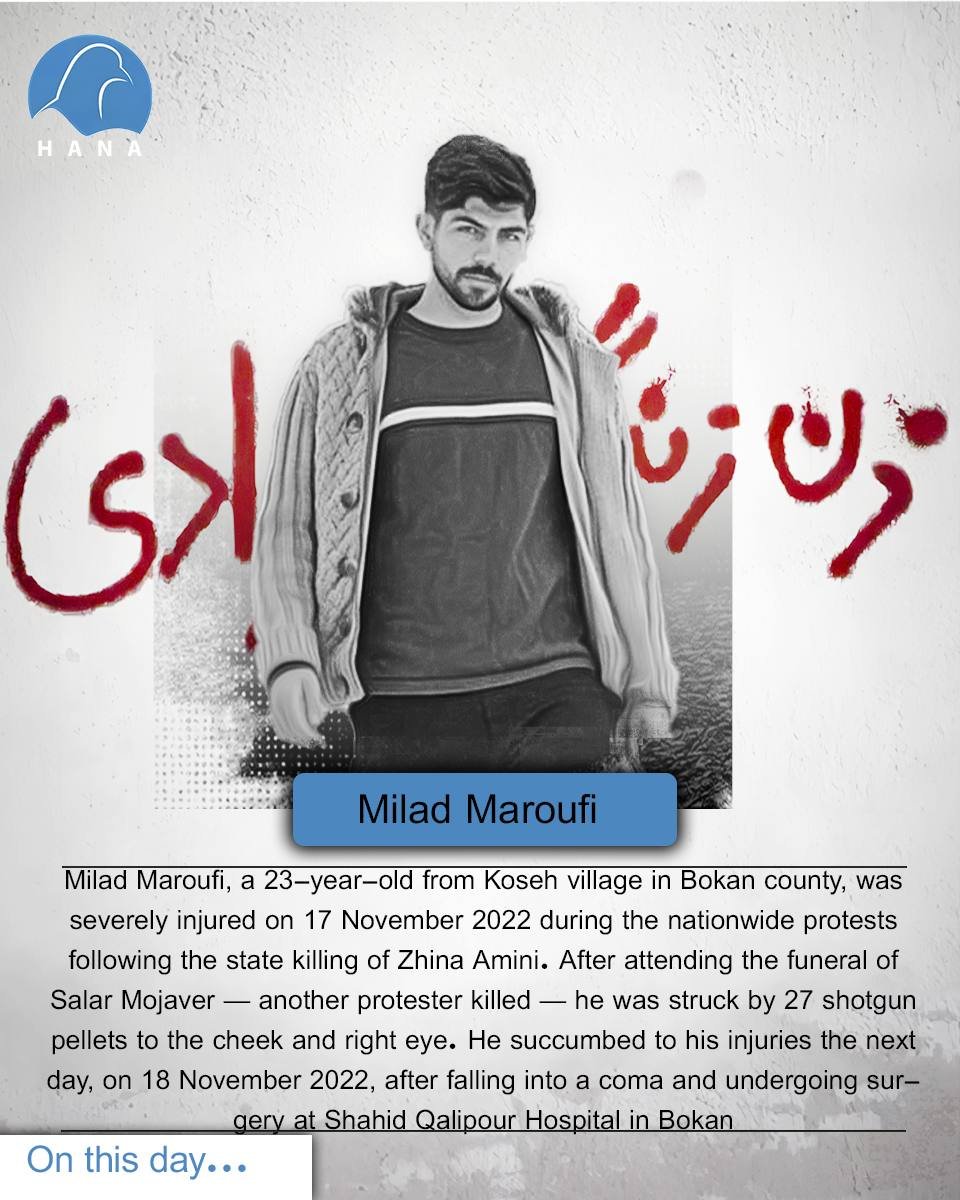 Milad Maroufi, a 23-year-old from Koseh village in Bokan county, was severely injured on 17 November 2022 during the nationwide protests following the state killing of Zhina Amini. After attending the funeral of Salar Mojaver — another protester killed — he was struck by 27 shotgun pellets to the cheek and right eye. He succumbed to his injuries the next day, on 18 November 2022, after falling into a coma and undergoing surgery at Shahid Qalipour Hospital in Bokan.
