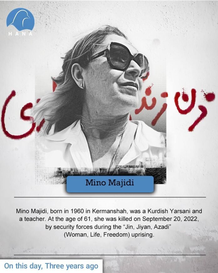 Mino Majidi, born in 1960 in Kermanshah, was a Kurdish Yarsani and a teacher. At the age of 61, she was killed on September 20, 2022, by security forces during the “Jin, Jiyan, Azadi” (Woman, Life, Freedom) uprising.