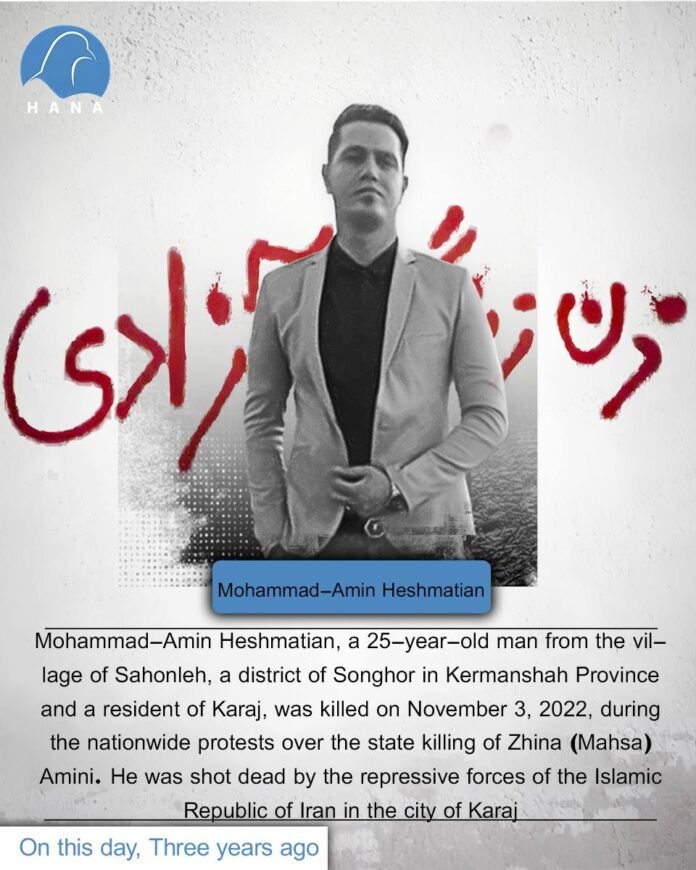 Mohammad-Amin Heshmatian, a 25-year-old man from the village of Sahonleh, a district of Songhor in Kermanshah Province and a resident of Karaj, was killed on November 3, 2022, during the nationwide protests over the state killing of Zhina (Mahsa) Amini. He was shot dead by the repressive forces of the Islamic Republic of Iran in the city of Karaj.
