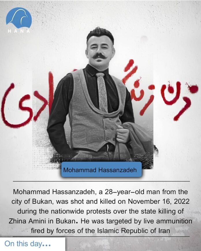 Mohammad Hassanzadeh, a 28-year-old man from the city of Bukan, was shot and killed on November 16, 2022 during the nationwide protests over the state killing of Zhina Amini in Bukan. He was targeted by live ammunition fired by forces of the Islamic Republic of Iran.