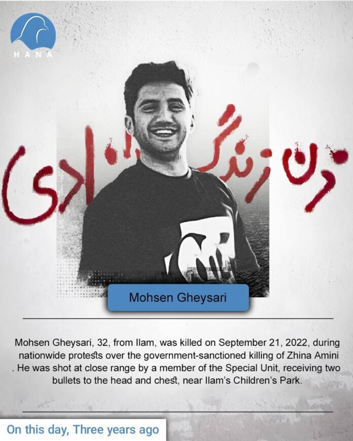 Mohsen Gheysari, 32, from Ilam, was killed on September 21, 2022, during nationwide protests over the government-sanctioned killing of Zhina Amini. He was shot at close range by a member of the Special Unit, receiving two bullets to the head and chest, near Ilam’s Children’s Park.
