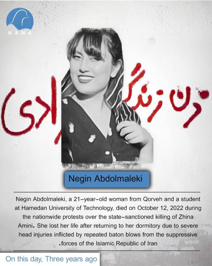 Negin Abdolmaleki, a 21-year-old woman from Qorveh and a student at Hamedan University of Technology, died on October 12, 2022 during the nationwide protests over the state-sanctioned killing of Zhina Amini. She lost her life after returning to her dormitory due to severe head injuries inflicted by repeated baton blows from the suppressive forces of the Islamic Republic of Iran.