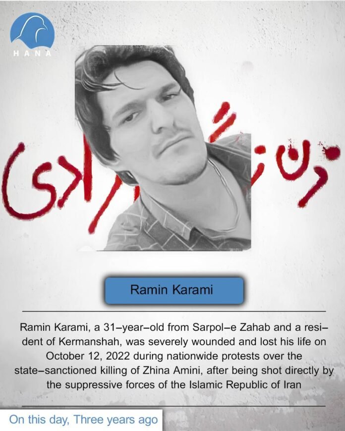 Ramin Karami, a 31-year-old from Sarpol-e Zahab and a resident of Kermanshah, was severely wounded and lost his life on October 12, 2022 during nationwide protests over the state-sanctioned killing of Zhina Amini, after being shot directly by the suppressive forces of the Islamic Republic of Iran.