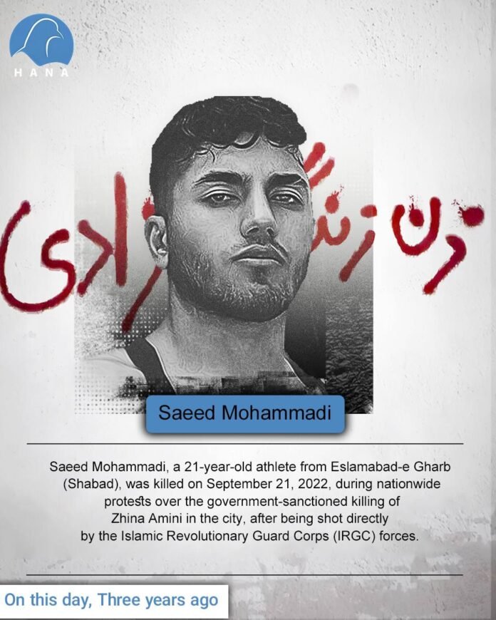 Saeed Mohammadi, a 21-year-old athlete from Eslamabad-e Gharb (Shabad), was killed on September 21, 2022, during nationwide protests over the government-sanctioned killing of Zhina Amini in the city, after being shot directly by the Islamic Revolutionary Guard Corps (IRGC) forces.