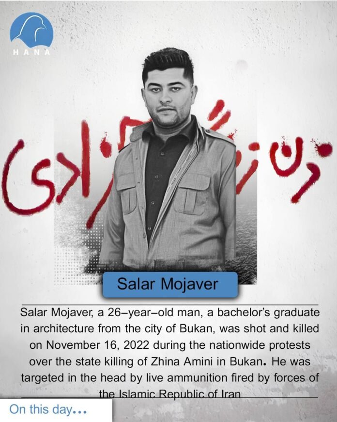Salar Mojaver, a 26-year-old man, a bachelor’s graduate in architecture from the city of Bukan, was shot and killed on November 16, 2022 during the nationwide protests over the state killing of Zhina Amini in Bukan. He was targeted in the head by live ammunition fired by forces of the Islamic Republic of Iran.