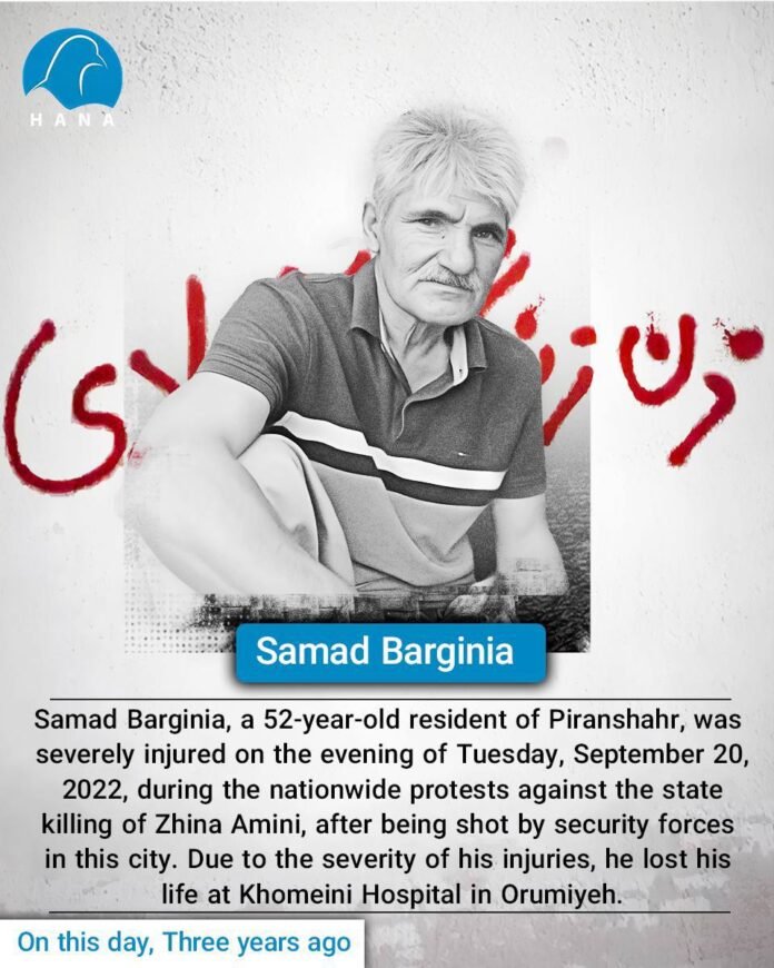 Samad Barginia, a 52-year-old resident of Piranshahr, was severely injured on the evening of Tuesday, September 20, 2022, during the nationwide protests against the state killing of Zhina Amini, after being shot by security forces in this city. Due to the severity of his injuries, he lost his life at Khomeini Hospital in Orumiyeh.