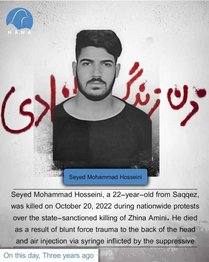 Seyed Mohammad Hosseini, a 22-year-old from Saqqez, was killed on October 20, 2022 during nationwide protests over the state-sanctioned killing of Zhina Amini. He died as a result of blunt force trauma to the back of the head and air injection via syringe inflicted by the suppressive