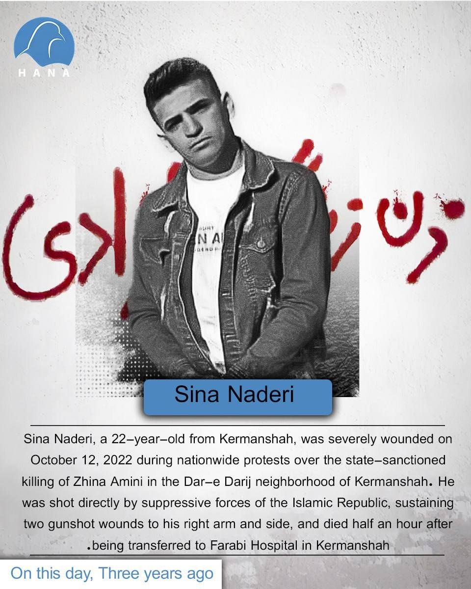 Sina Naderi, a 22-year-old from Kermanshah, was severely wounded on October 12, 2022 during nationwide protests over the state-sanctioned killing of Zhina Amini in the Dar-e Darij neighborhood of Kermanshah. He was shot directly by suppressive forces of the Islamic Republic, sustaining two gunshot wounds to his right arm and side, and died half an hour after being transferred to Farabi Hospital in Kermanshah.