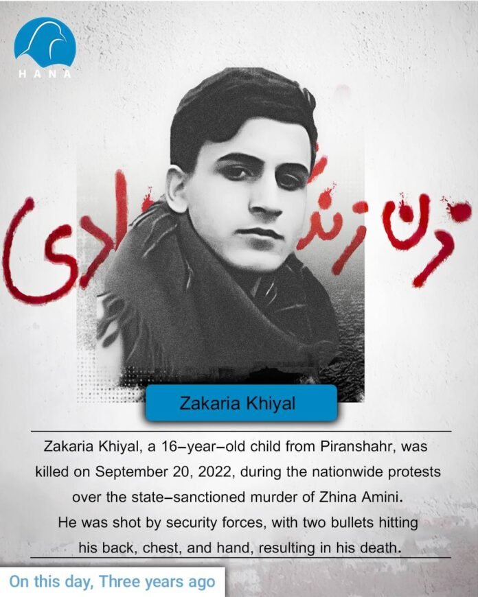 Zakaria Khiyal, a 16-year-old child from Piranshahr, was killed on September 20, 2022, during the nationwide protests over the state-sanctioned murder of Zhina Amini. He was shot by security forces, with two bullets hitting his back, chest, and hand, resulting in his death.