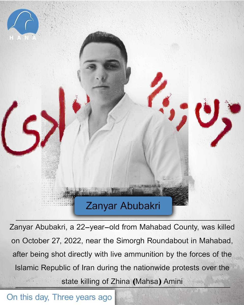 Zanyar Abubakri, a 22-year-old from Mahabad County, was killed on October 27, 2022, near the Simorgh Roundabout in Mahabad, after being shot directly with live ammunition by the forces of the Islamic Republic of Iran during the nationwide protests over the state killing of Zhina (Mahsa) Amini.