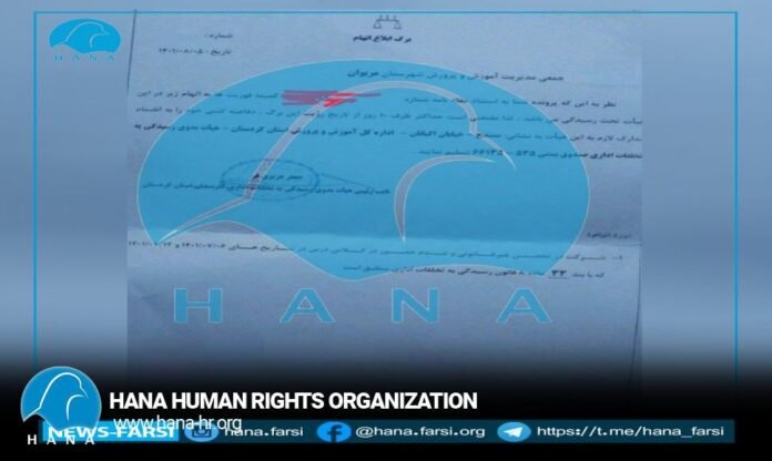 According to the reports received by Hana Human Rights Organization: Marivan education management in order to create terror among school teachers and prevent them from participating in gatherings, strikes and protests, on “27, 10, 2022” according to paragraph 33, article 8 of the Administrative Offenses Handling Law sent a complaint to the Administrative Offenses Council.