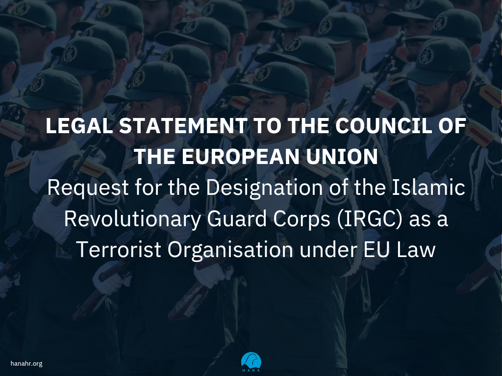 Hana Human Rights Organization (HANA) respectfully submits this legal statement urging the Council of the European Union to designate the Islamic Revolutionary Guard Corps (IRGC) as a terrorist organization under the EU’s counter-terrorism listing regime, in particular Council Common Position 2001/931/CFSP and Council Regulation (EC) No 2580/2001.