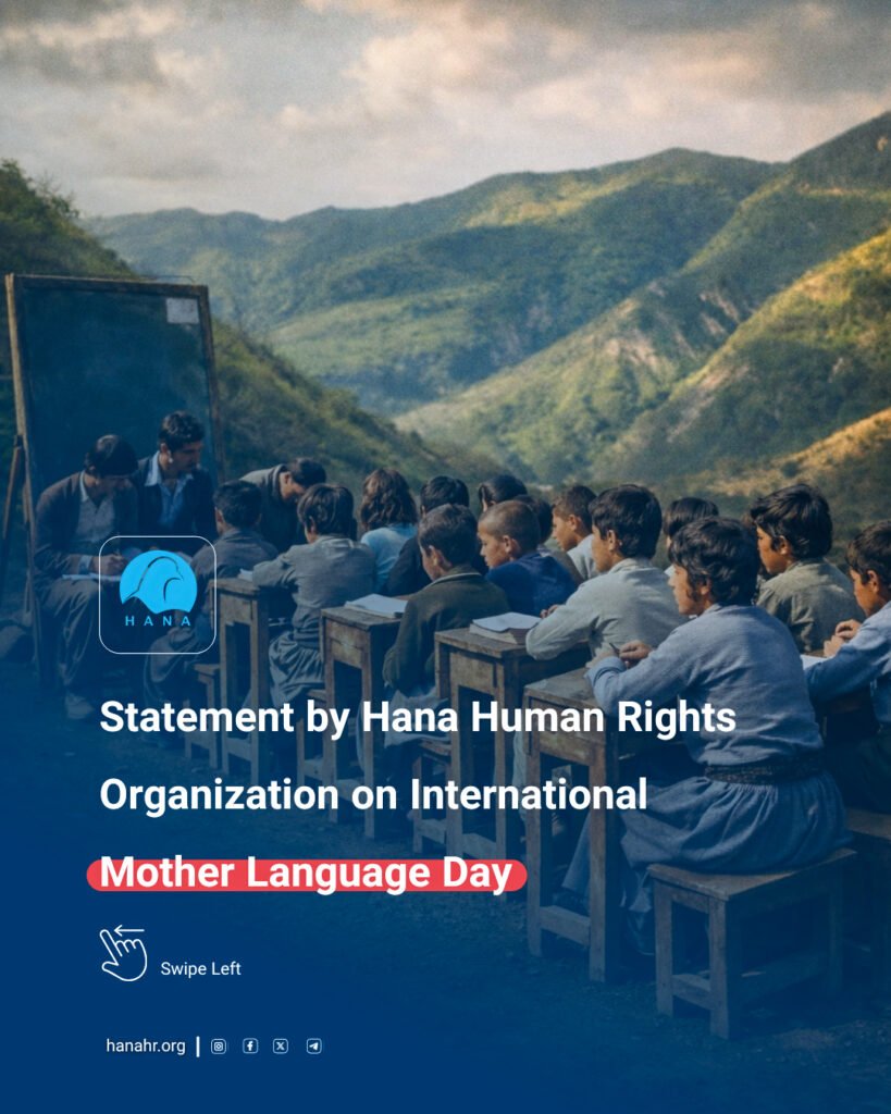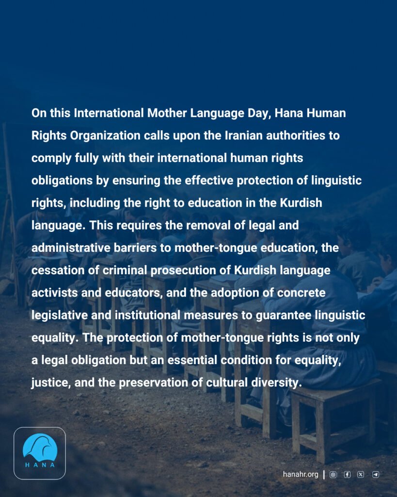 On this International Mother Language Day, Hana Human Rights Organization calls upon the Iranian authorities to comply fully with their international human rights obligations by ensuring the effective protection of linguistic rights, including the right to education in the Kurdish language. This requires the removal of legal and administrative barriers to mother-tongue education, the cessation of criminal prosecution of Kurdish language activists and educators, and the adoption of concrete legislative and institutional measures to guarantee linguistic equality. The protection of mother-tongue rights is not only a legal obligation but an essential condition for equality, justice, and the preservation of cultural diversity.