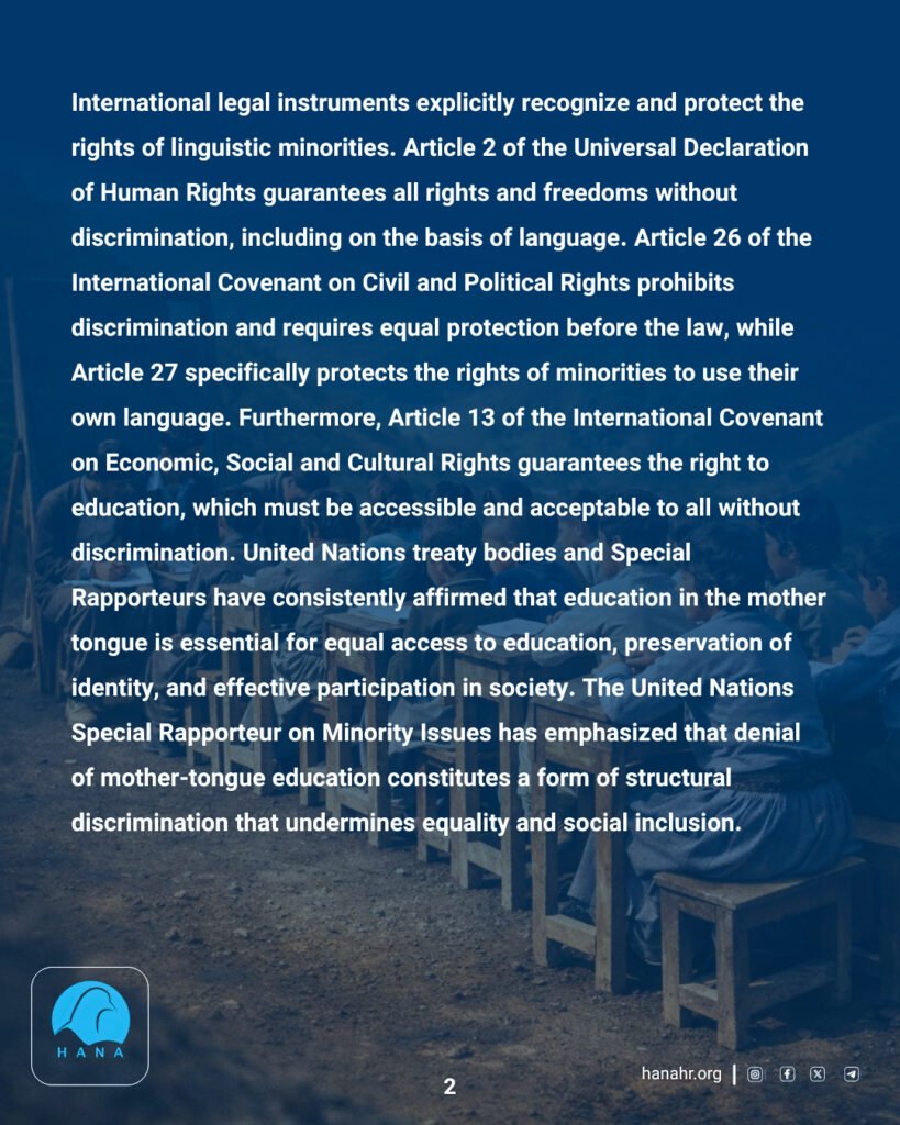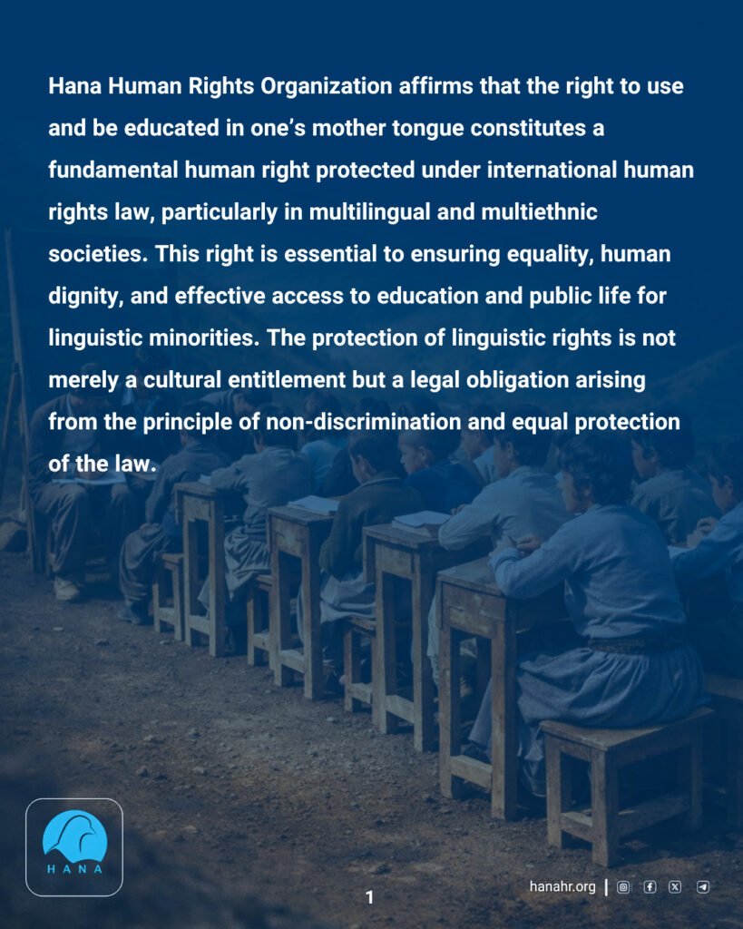 Hana Human Rights Organization affirms that the right to use and be educated in one’s mother tongue constitutes a fundamental human right protected under international human rights law, particularly in multilingual and multiethnic societies. This right is essential to ensuring equality, human dignity, and effective access to education and public life for linguistic minorities. The protection of linguistic rights is not merely a cultural entitlement but a legal obligation arising from the principle of non-discrimination and equal protection of the law.