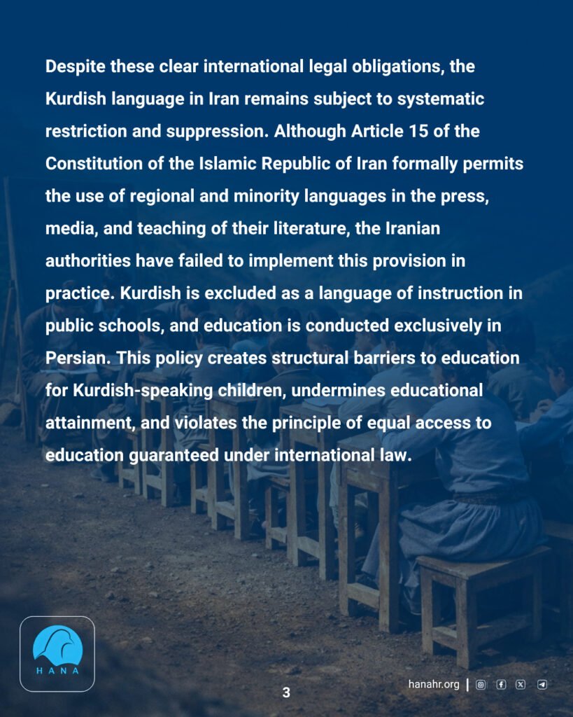 Despite these clear international legal obligations, the Kurdish language in Iran remains subject to systematic restriction and suppression. Although Article 15 of the Constitution of the Islamic Republic of Iran formally permits the use of regional and minority languages in the press, media, and teaching of their literature, the Iranian authorities have failed to implement this provision in practice. Kurdish is excluded as a language of instruction in public schools, and education is conducted exclusively in Persian. This policy creates structural barriers to education for Kurdish-speaking children, undermines educational attainment, and violates the principle of equal access to education guaranteed under international law.