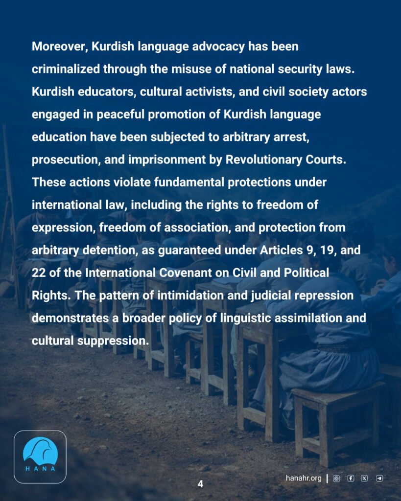 Moreover, Kurdish language advocacy has been criminalized through the misuse of national security laws. Kurdish educators, cultural activists, and civil society actors engaged in peaceful promotion of Kurdish language education have been subjected to arbitrary arrest, prosecution, and imprisonment by Revolutionary Courts. These actions violate fundamental protections under international law, including the rights to freedom of expression, freedom of association, and protection from arbitrary detention, as guaranteed under Articles 9, 19, and 22 of the International Covenant on Civil and Political Rights. The pattern of intimidation and judicial repression demonstrates a broader policy of linguistic assimilation and cultural suppression.
