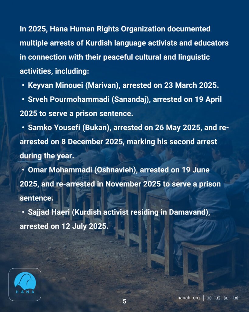 In 2025, Hana Human Rights Organization documented multiple arrests of Kurdish language activists and educators in connection with their peaceful cultural and linguistic activities, including: