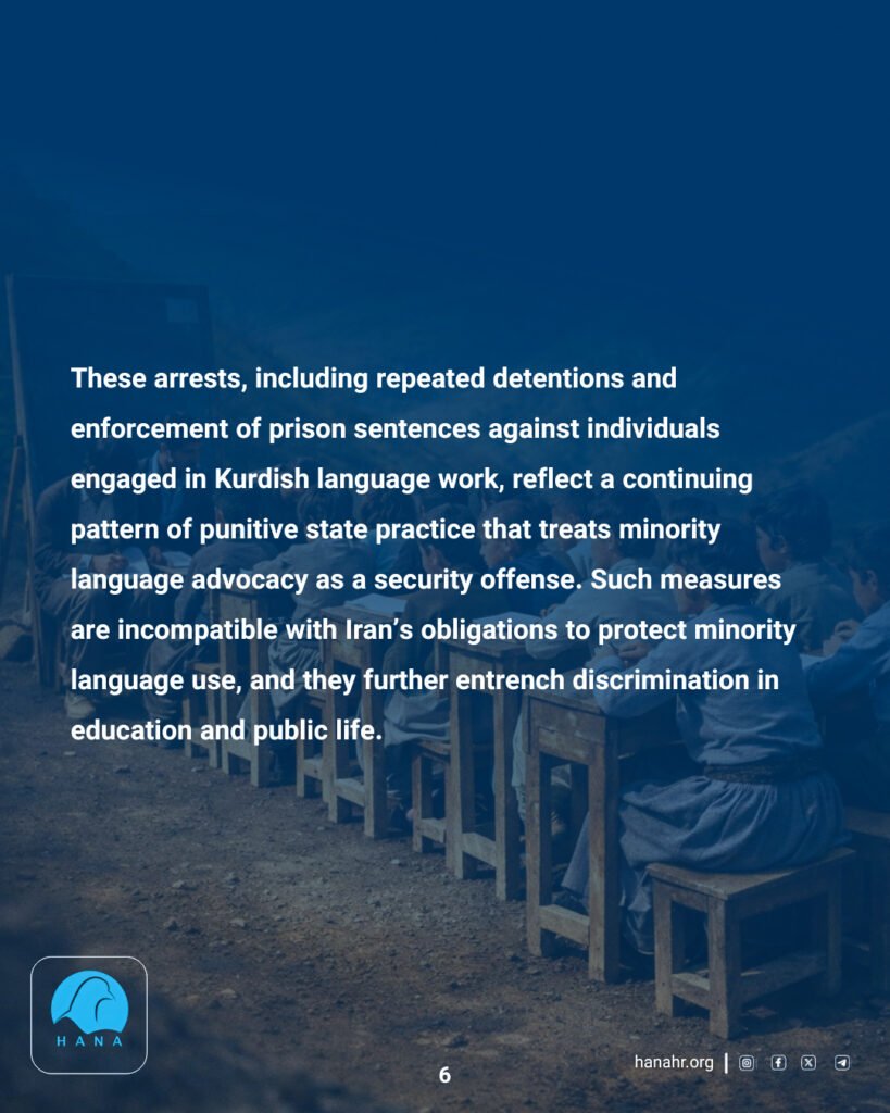 These arrests, including repeated detentions and enforcement of prison sentences against individuals engaged in Kurdish language work, reflect a continuing pattern of punitive state practice that treats minority language advocacy as a security offense. Such measures are incompatible with Iran’s obligations to protect minority language use, and they further entrench discrimination in education and public life.