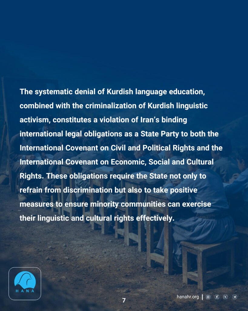The systematic denial of Kurdish language education, combined with the criminalization of Kurdish linguistic activism, constitutes a violation of Iran’s binding international legal obligations as a State Party to both the International Covenant on Civil and Political Rights and the International Covenant on Economic, Social and Cultural Rights. These obligations require the State not only to refrain from discrimination but also to take positive measures to ensure minority communities can exercise their linguistic and cultural rights effectively.