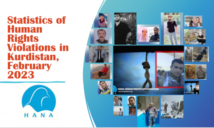 Hana: Hana human rights organization statistical center publishes its statistical report on the human rights situation and the violation of fundamental rights of Kurdish citizens in February 2023 in Iranian Kurdistan. Due to the lack of free access to news and events inside the country, these statistics cannot include all violations of citizens’ rights, but all the efforts of Hana’s human rights colleagues inside the country are in order to be extremely careful in the insertion of news and fact-checking of the published cases.
