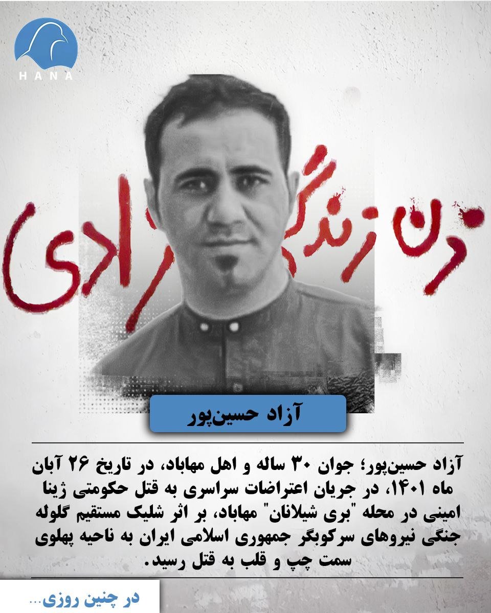 آزاد حسین‌پور؛ جوان ۳۰ ساله و اهل مهاباد، در تاریخ ٢٦ آبان ماه ١٤٠١، در جریان اعتراضات سراسری به قتل حکومتی ژینا امینی در محله “بری شیلانان” مهاباد، بر اثر شلیک مستقیم گلوله جنگی نیروهای سرکوبگر جمهوری اسلامی ایران بە ناحیه پهلوی سمت چپ و قلب به قتل رسید.