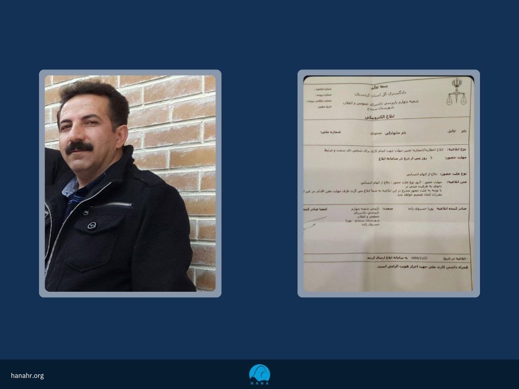 سازمان حقوق بشر هانا مطلع شدە؛ در ادامه موج احضار و بازداشت فعالان مدنی و کارگری در شهرهای مختلف کردستان، توفیق محمودی، فعال کارگری و اهل شهرستان سنندج، با دریافتی ابلاغیه‌ای رسمی به دادسرای عمومی و انقلاب این شهرستان احضار شد.