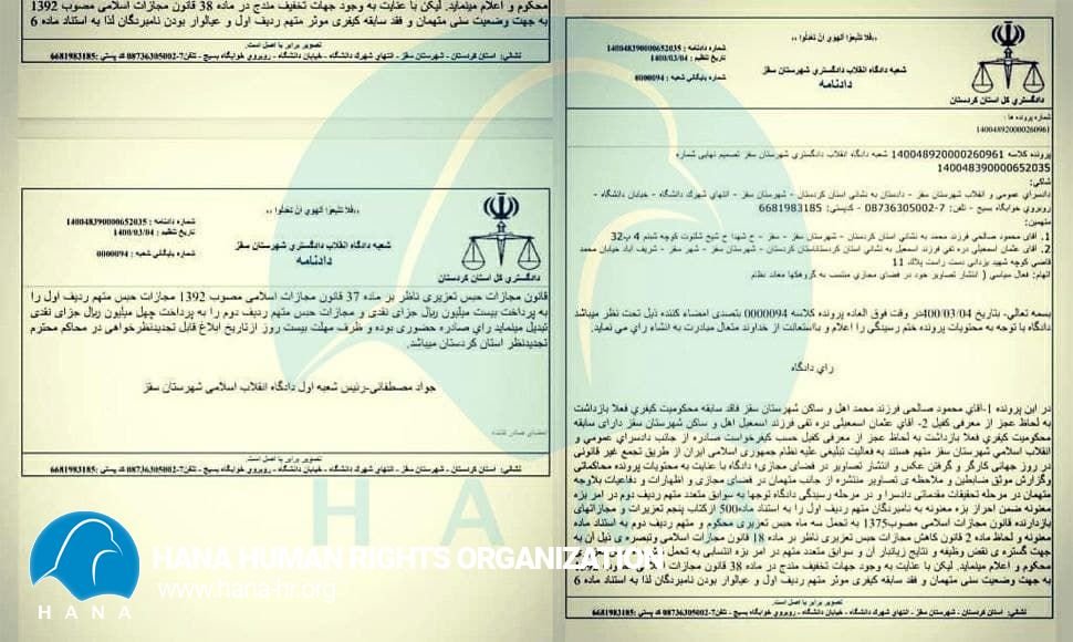 هانا: طبق گزارش دریافتی از همکاران هانا در شهرستان سقز ”محمود صالحی و عثمان اسماعیلی را بابت اتهامات” فعالیت سیاسی و برگزاری مراسم روز جهانی کارگر و همچنین گرفتن عکس و انتشار آن در فضای مجازی از سوی شعبە دادگاە انقلاب دادگستری شهرستان سقزبه پرداخت جریمە نقدی محکوم شدند.