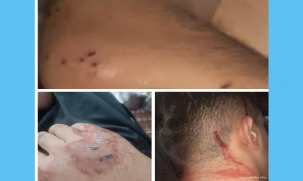 تصویری ارسالی بە سازمان حقوق بشری هانا، از یک جوان ٢٠ سالە اهل سنندج کە شب گذشتە توسط نیروهای سرکوبگر با شلیک گلولە با سلاح ساچمەای بە شدت از ناحیە دست و سر زخمی شدە است.