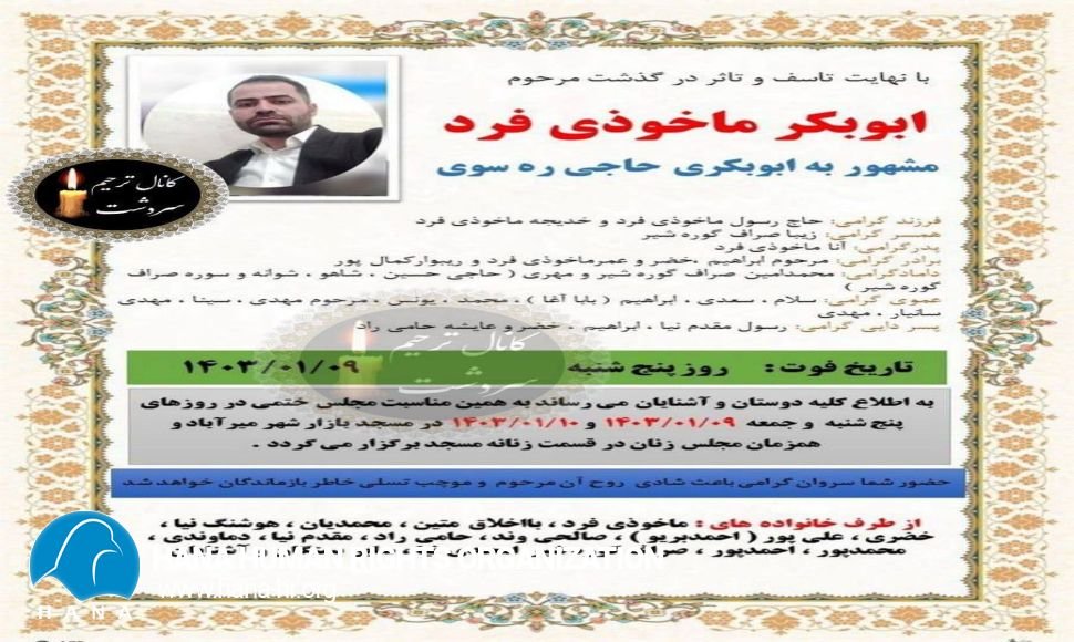 بر اساس گزارشات رسیدە بە سمان حقوق بشری هانا: روز پنجشنبه “۹ فروردین ماە ١٤٠٣” یک کولبر دیگر با هویت “ابوبکر ماخوذیفرد” فرزند رسول و خدیجە اهل میرآباد سردشت بر اثر سقوط از ارتفاعات مرزی “وزینه” سردشت جان خود را از دست داد.