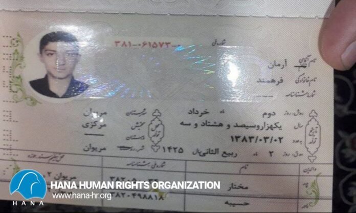 هویت این شهروند کرد "آرمان فرهمند" ۱۷ سالە اهل روستای "سردوش" از توابع شهرستان مریوان عنوان شدە است. طبق گزارشات دریافتی نامبردە روز دوشنبە "۳۱ آگوست ۲۰۲۰" در یک درگیری جمعی در شهرستان "مریوان" موجب بە قتل رسیدن یک شهروند باهویت "پویا چارە طلب" همراە با ٨ نفر دیگر بازداشت شدە وی در کانون اصلاح و تربیت شهرستان "سنندج" بە دلیل بلاتکلیفی وعدم رسیدگی بە پروندەاش توسط شعبە دوم بازپرسی شهرستان مریوان اعتصاب غذا کردە و لب های خود رادوختە است.