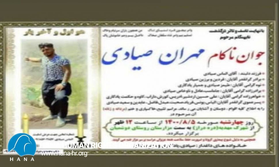 بر پایە گزارشات دریافتی از همکاران هانا: یک شهروند کُرد با هویت “مهران صیادی” فرزند “الیاس” ساکن شهرک “مهدیە درە دراز” از توابع شهرستان “کرمانشاە” بە دلایل نامعلوم با پسر عموی خود با هویت نامعلوم دعوا کردە کە هنگام دعوا توسط پسر عموی خود با اسلحە شکاری بە قتل رسیدە است.