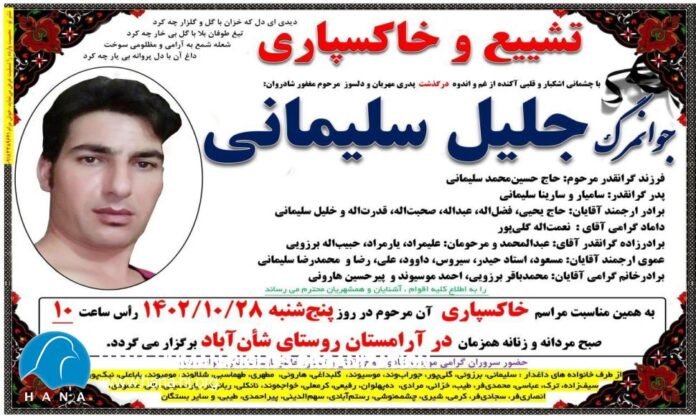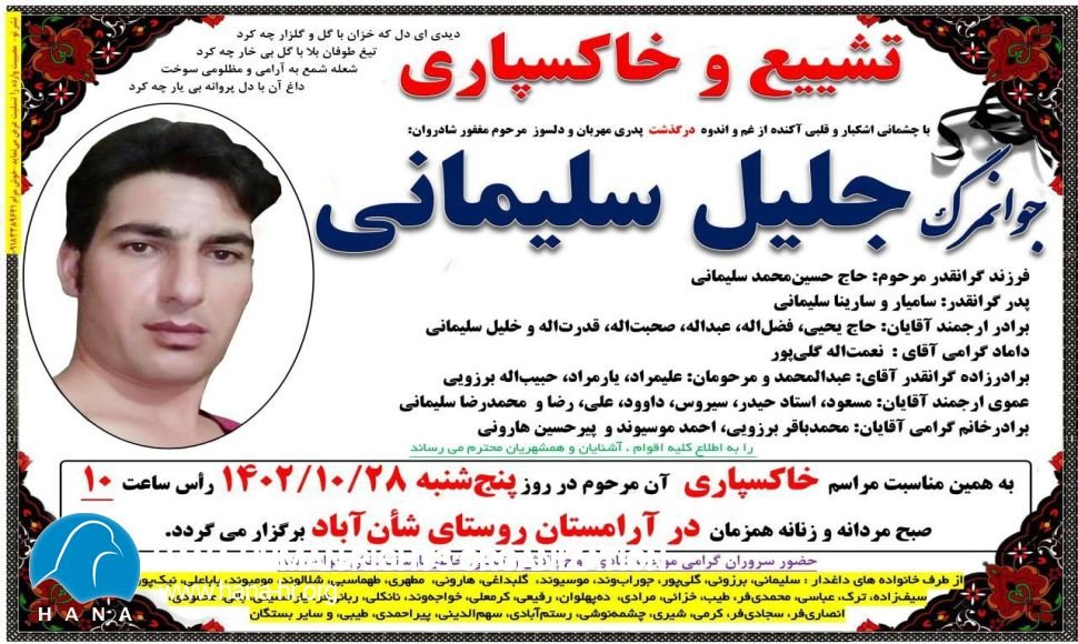 بر اساس گزارشات دریافتی سازمان حقوق بشری هانا: روز چهارشنبە “٢٧ دی ماە ١٤٠٢” حکم اعدام یک زندانی کورد با هویت “جلیل سلیمانی” فرزند حاج حسین محمد، اهل کنگاور و ساکن تویسرکان، در زندان مرکزی همدان بە اجرا درآمد.