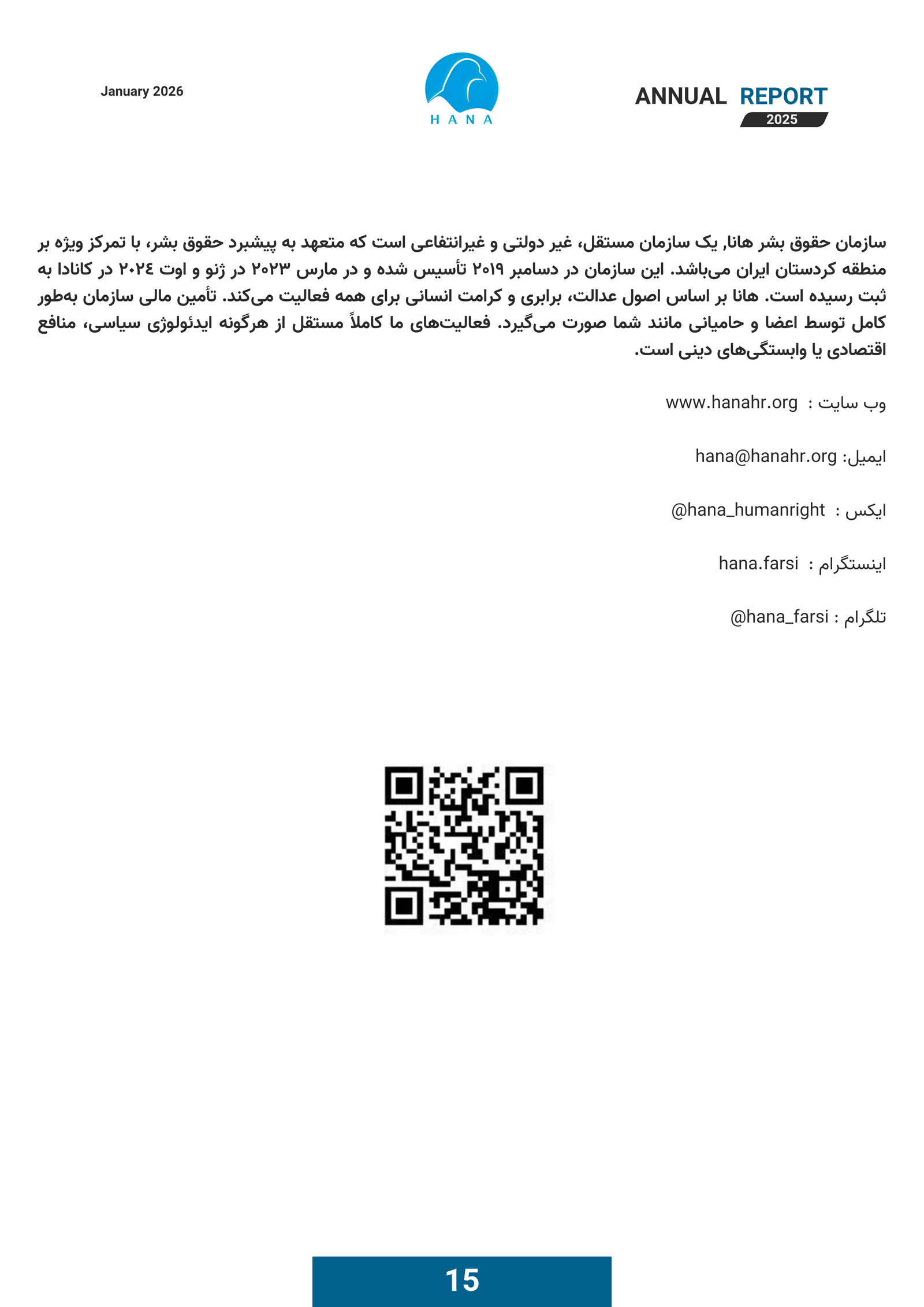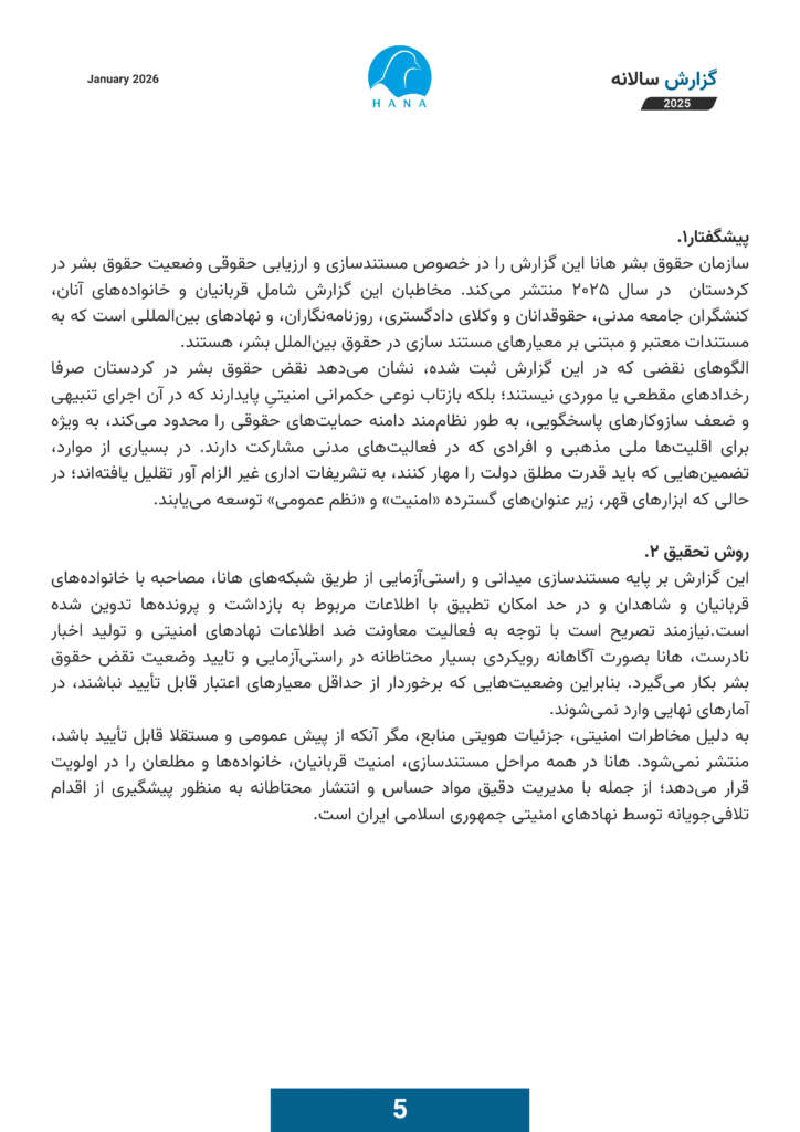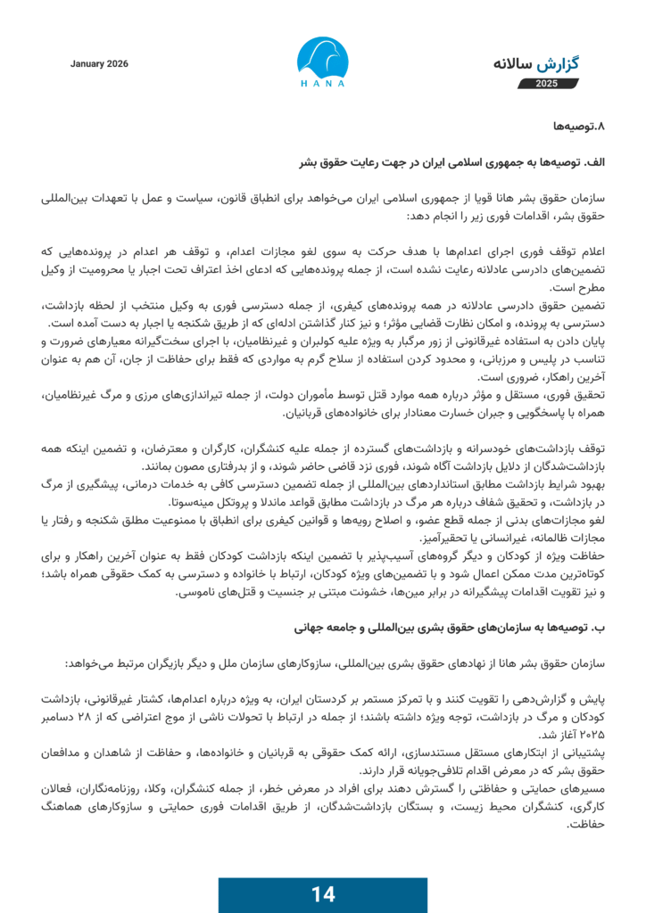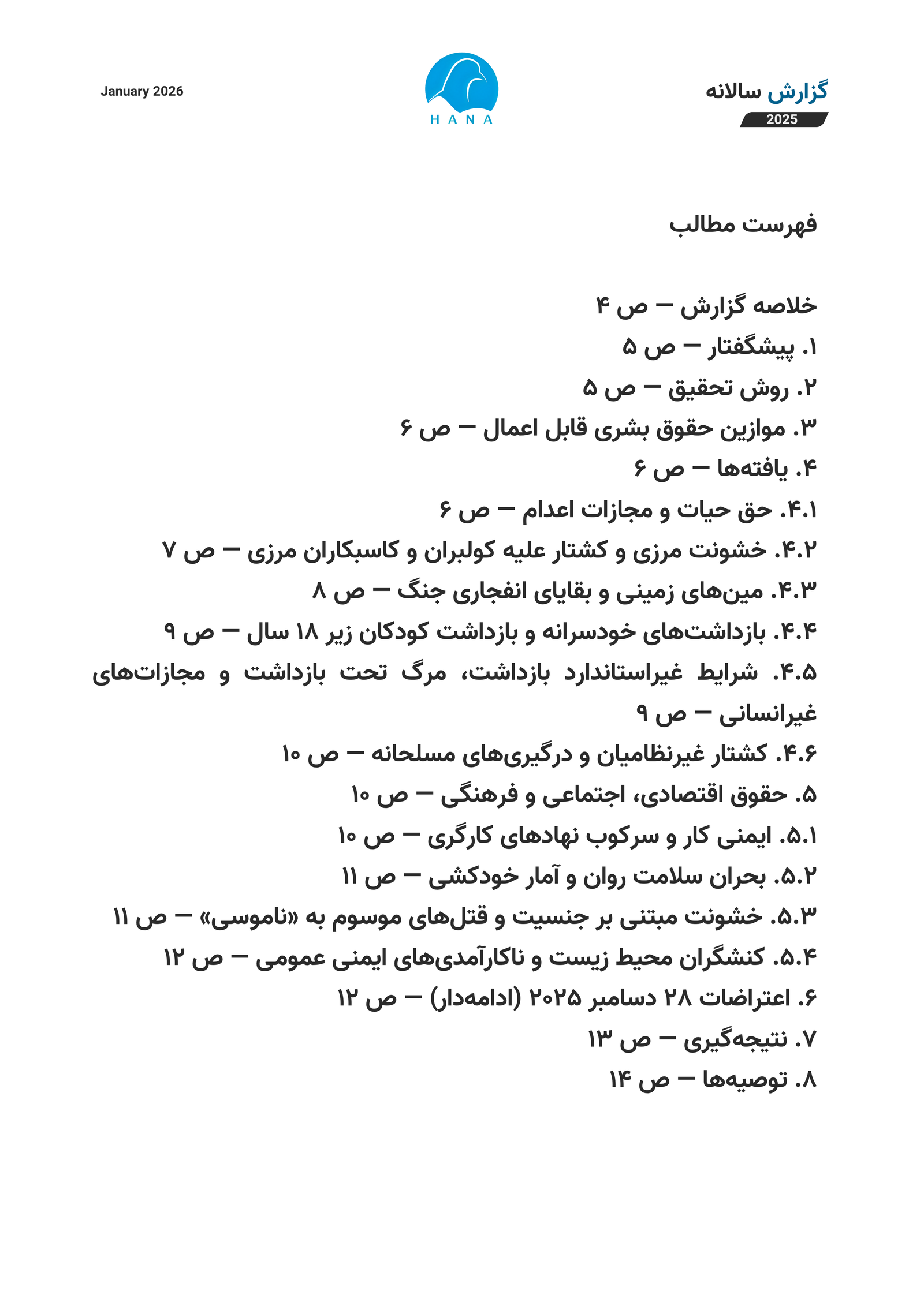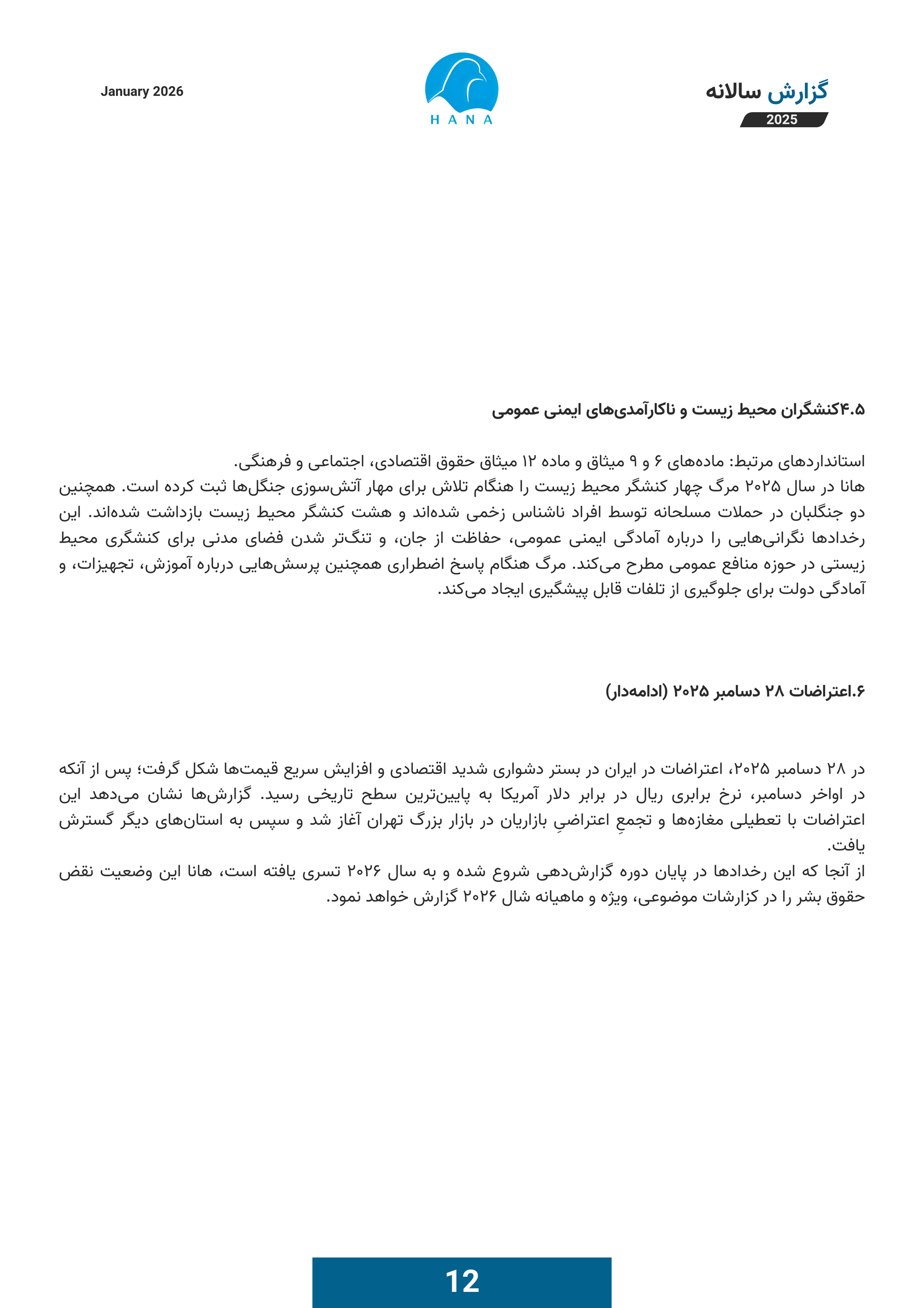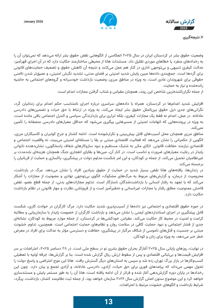 بازداشتهای خودسرانه در مقیاس گسترده ای افزایش یافته است. هانا ۸۲۷ مورد بازداشت شهروندان کُرد را ثبت کرده که شامل ۵۶ زن و ۲۹ مورد کودک زیر ۱۸ سال است. در پایان سال گزارشدهی، موج تازهای از اعترضات در سراسر کشور آغاز شده است. اعتراضات از ۲۸ دسامبر ۲۰۲۵ و در پی فشار شدید اقتصادی و فروپاشی ارزش پول ملی در مقابل دلار آمریکا شروع شد. گزارشها عامل اولیه را تعطیلی کسبوکارها توسط بازاریان در بازار بزرگ تهران و سپس گسترش اعتراضات به استانهای دیگر توصیف میکنند. چون این رخدادها در روزهای پایانی دوره گزارشدهی آغاز شده و به سال ۲۰۲۶ تسری یافته، هانا آن را در کزارشات ماهانه و موضوعی و ویژه در سال پیش روی گزارش خواهد نمود